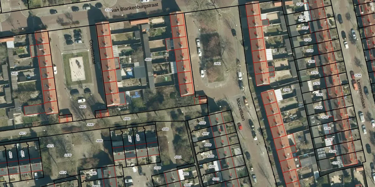 Het perceel waarop Mozartlaan 62 staat heeft een oppervlakte van 2415 m². Dit is een zeer groot perceel. De perceeloppervlakte wordt geregistreerd door het Kadaster. Gedetailleerde informatie over de maten van dit perceel kunt u vinden in het rapport Kadastrale kaart met maatvoering van Mozartlaan 62.