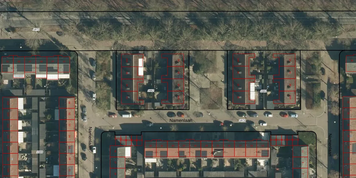 Het perceel waarop Namenlaan 40 staat heeft een oppervlakte van 1362 m². Dit is een zeer groot perceel. De perceeloppervlakte wordt geregistreerd door het Kadaster. Gedetailleerde informatie over de maten van dit perceel kunt u vinden in het rapport Kadastrale kaart met maatvoering van Namenlaan 40.