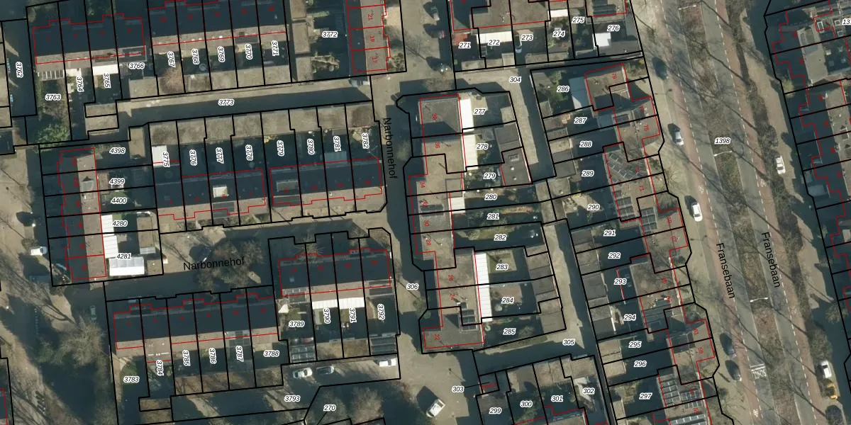 Het perceel waarop Narbonnehof 32 staat heeft een oppervlakte van 156 m². Dit is een middelgroot perceel. De perceeloppervlakte wordt geregistreerd door het Kadaster. Gedetailleerde informatie over de maten van dit perceel kunt u vinden in het rapport Kadastrale kaart met maatvoering van Narbonnehof 32.