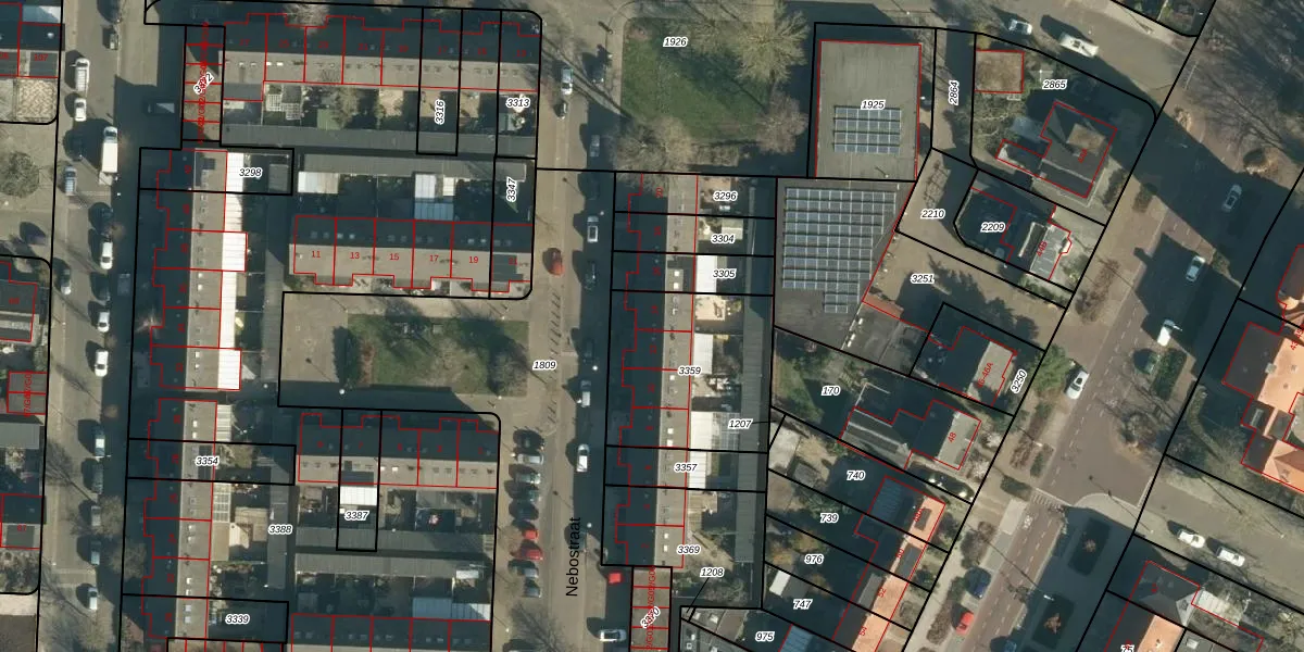 Nebostraat 14 is gelegen op kadastraal perceel WSL01M3359. Deze kadastrale aanduiding is uniek en wordt gebruikt door het Kadaster om eigendomsrechten en andere zakelijke rechten vast te leggen. Het perceel maakt onderdeel uit van de kadastrale gemeente Woensel.