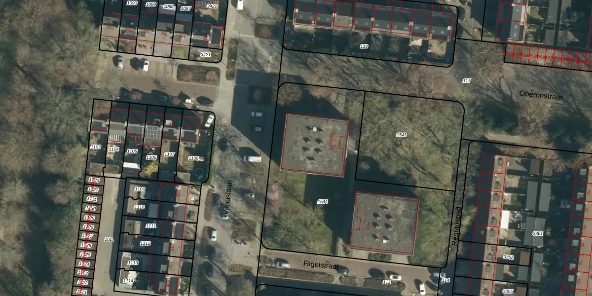 Het perceel waarop Oberonstraat 19 staat heeft een oppervlakte van 2562 m². Dit is een zeer groot perceel. De perceeloppervlakte wordt geregistreerd door het Kadaster. Gedetailleerde informatie over de maten van dit perceel kunt u vinden in het rapport Kadastrale kaart met maatvoering van Oberonstraat 19.
