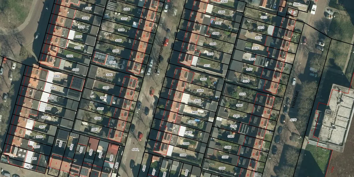 Het perceel waarop Ockeghemstraat 17 staat heeft een oppervlakte van 202 m². Dit is een middelgroot perceel. De perceeloppervlakte wordt geregistreerd door het Kadaster. Gedetailleerde informatie over de maten van dit perceel kunt u vinden in het rapport Kadastrale kaart met maatvoering van Ockeghemstraat 17.