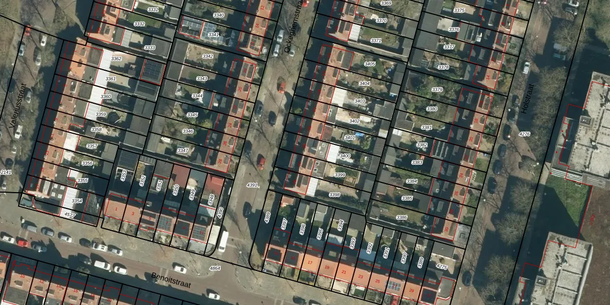 Het perceel waarop Ockeghemstraat 25 staat heeft een oppervlakte van 201 m². Dit is een middelgroot perceel. De perceeloppervlakte wordt geregistreerd door het Kadaster. Gedetailleerde informatie over de maten van dit perceel kunt u vinden in het rapport Kadastrale kaart met maatvoering van Ockeghemstraat 25.