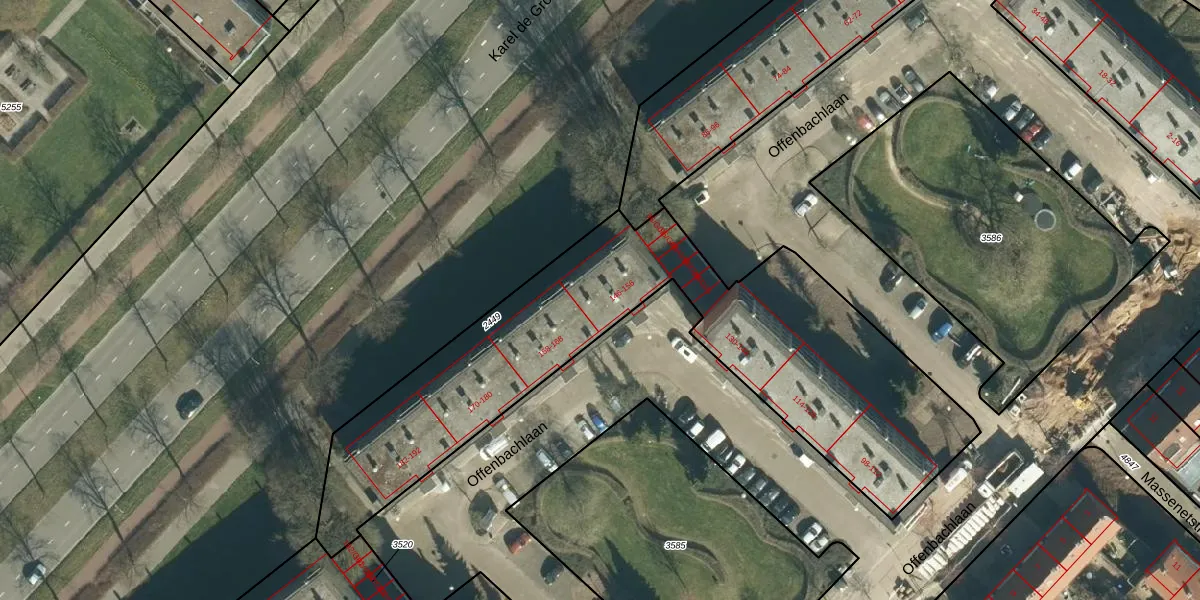 Het perceel waarop Offenbachlaan 152 staat heeft een oppervlakte van 2114 m². Dit is een zeer groot perceel. De perceeloppervlakte wordt geregistreerd door het Kadaster. Gedetailleerde informatie over de maten van dit perceel kunt u vinden in het rapport Kadastrale kaart met maatvoering van Offenbachlaan 152.
