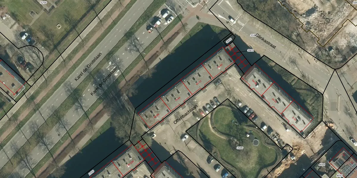 Het perceel waarop Offenbachlaan 82 staat heeft een oppervlakte van 2190 m². Dit is een zeer groot perceel. De perceeloppervlakte wordt geregistreerd door het Kadaster. Gedetailleerde informatie over de maten van dit perceel kunt u vinden in het rapport Kadastrale kaart met maatvoering van Offenbachlaan 82.