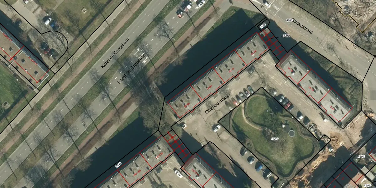 Het perceel waarop Offenbachlaan 94 staat heeft een oppervlakte van 2190 m². Dit is een zeer groot perceel. De perceeloppervlakte wordt geregistreerd door het Kadaster. Gedetailleerde informatie over de maten van dit perceel kunt u vinden in het rapport Kadastrale kaart met maatvoering van Offenbachlaan 94.