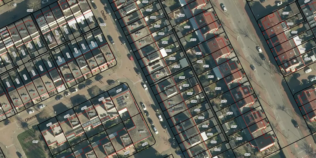 Het perceel waarop Otello 23 staat heeft een oppervlakte van 166 m². Dit is een middelgroot perceel. De perceeloppervlakte wordt geregistreerd door het Kadaster. Gedetailleerde informatie over de maten van dit perceel kunt u vinden in het rapport Kadastrale kaart met maatvoering van Otello 23.