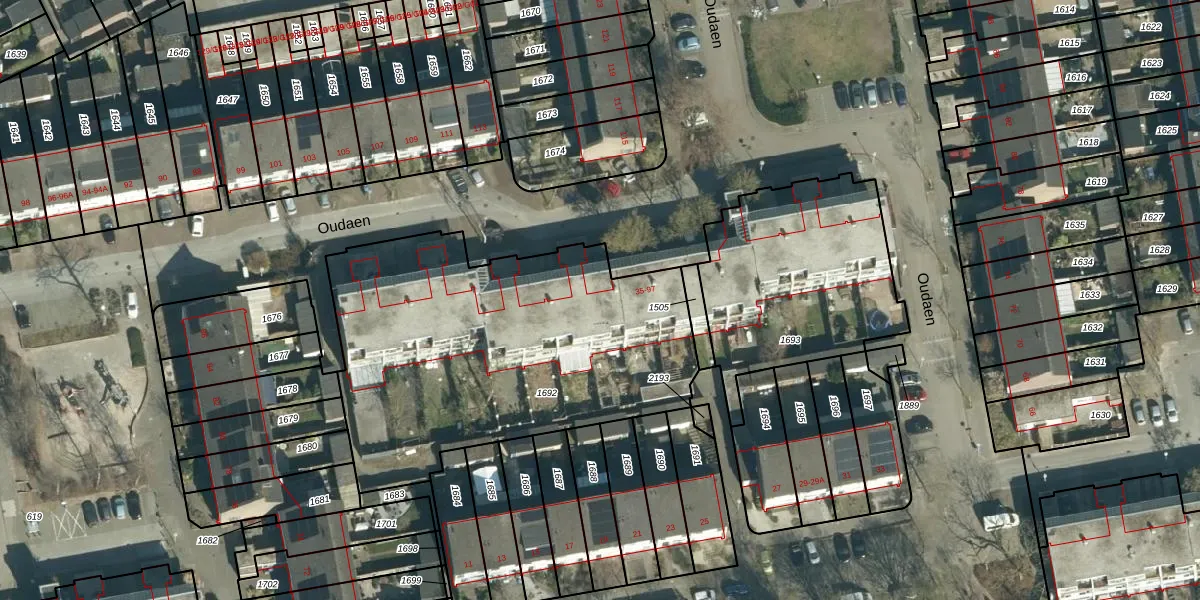 Het perceel waarop Oudaen 43 staat heeft een oppervlakte van 1878 m². Dit is een zeer groot perceel. De perceeloppervlakte wordt geregistreerd door het Kadaster. Gedetailleerde informatie over de maten van dit perceel kunt u vinden in het rapport Kadastrale kaart met maatvoering van Oudaen 43.