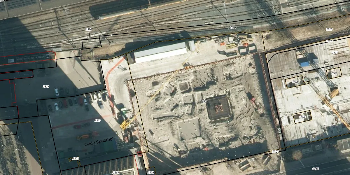 Het perceel waarop Oude Spoorhof 101-106 staat heeft een oppervlakte van 5621 m². Dit is een zeer groot perceel. De perceeloppervlakte wordt geregistreerd door het Kadaster. Gedetailleerde informatie over de maten van dit perceel kunt u vinden in het rapport Kadastrale kaart met maatvoering van Oude Spoorhof 101-106.