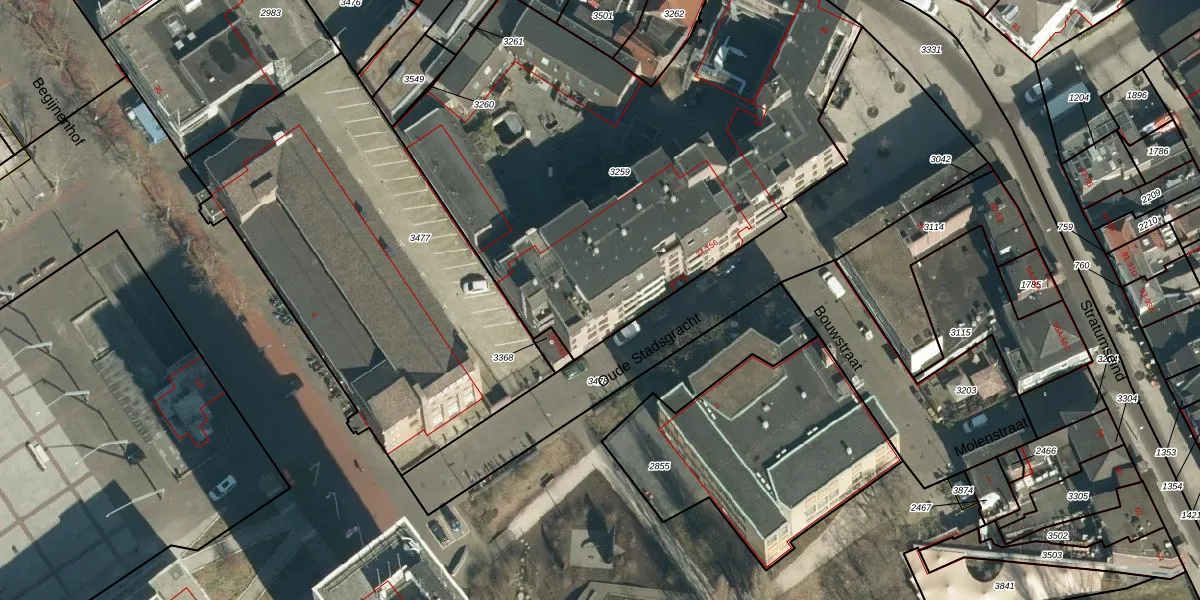 Het perceel waarop Oude Stadsgracht 38 staat heeft een oppervlakte van 2875 m². Dit is een zeer groot perceel. De perceeloppervlakte wordt geregistreerd door het Kadaster. Gedetailleerde informatie over de maten van dit perceel kunt u vinden in het rapport Kadastrale kaart met maatvoering van Oude Stadsgracht 38.