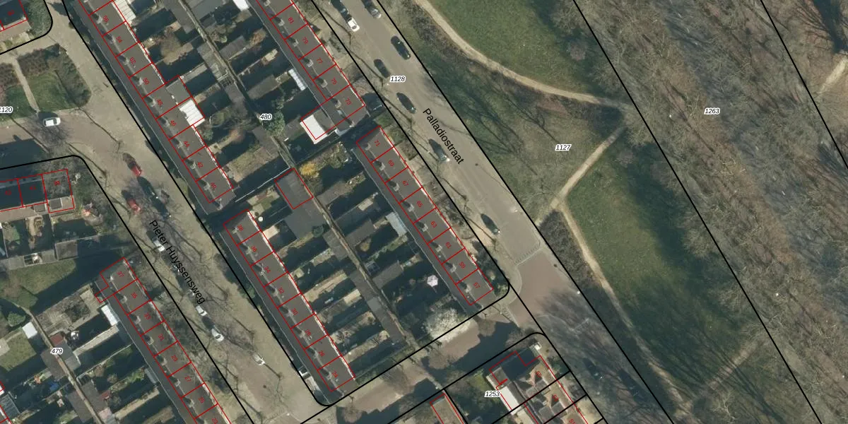 Het perceel waarop Palladiostraat 65 staat heeft een oppervlakte van 6855 m². Dit is een zeer groot perceel. De perceeloppervlakte wordt geregistreerd door het Kadaster. Gedetailleerde informatie over de maten van dit perceel kunt u vinden in het rapport Kadastrale kaart met maatvoering van Palladiostraat 65.