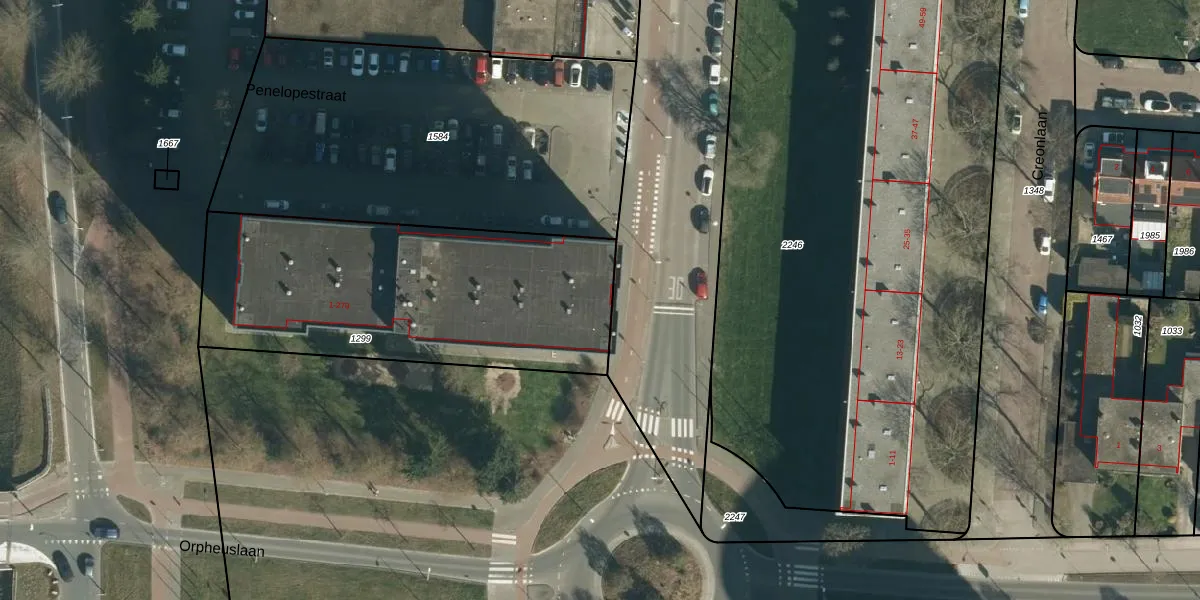 Het perceel waarop Penelopestraat 169 staat heeft een oppervlakte van 1528 m². Dit is een zeer groot perceel. De perceeloppervlakte wordt geregistreerd door het Kadaster. Gedetailleerde informatie over de maten van dit perceel kunt u vinden in het rapport Kadastrale kaart met maatvoering van Penelopestraat 169.