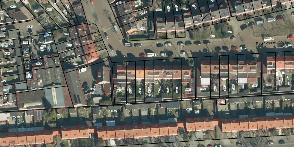 Het perceel waarop Peter van Anrooylaan 43 staat heeft een oppervlakte van 179 m². Dit is een middelgroot perceel. De perceeloppervlakte wordt geregistreerd door het Kadaster. Gedetailleerde informatie over de maten van dit perceel kunt u vinden in het rapport Kadastrale kaart met maatvoering van Peter van Anrooylaan 43.