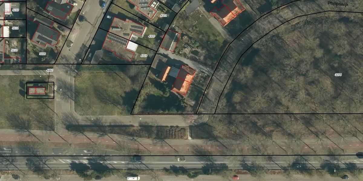Het perceel waarop Philipswijk 19 staat heeft een oppervlakte van 6985 m². Dit is een zeer groot perceel. De perceeloppervlakte wordt geregistreerd door het Kadaster. Gedetailleerde informatie over de maten van dit perceel kunt u vinden in het rapport Kadastrale kaart met maatvoering van Philipswijk 19.