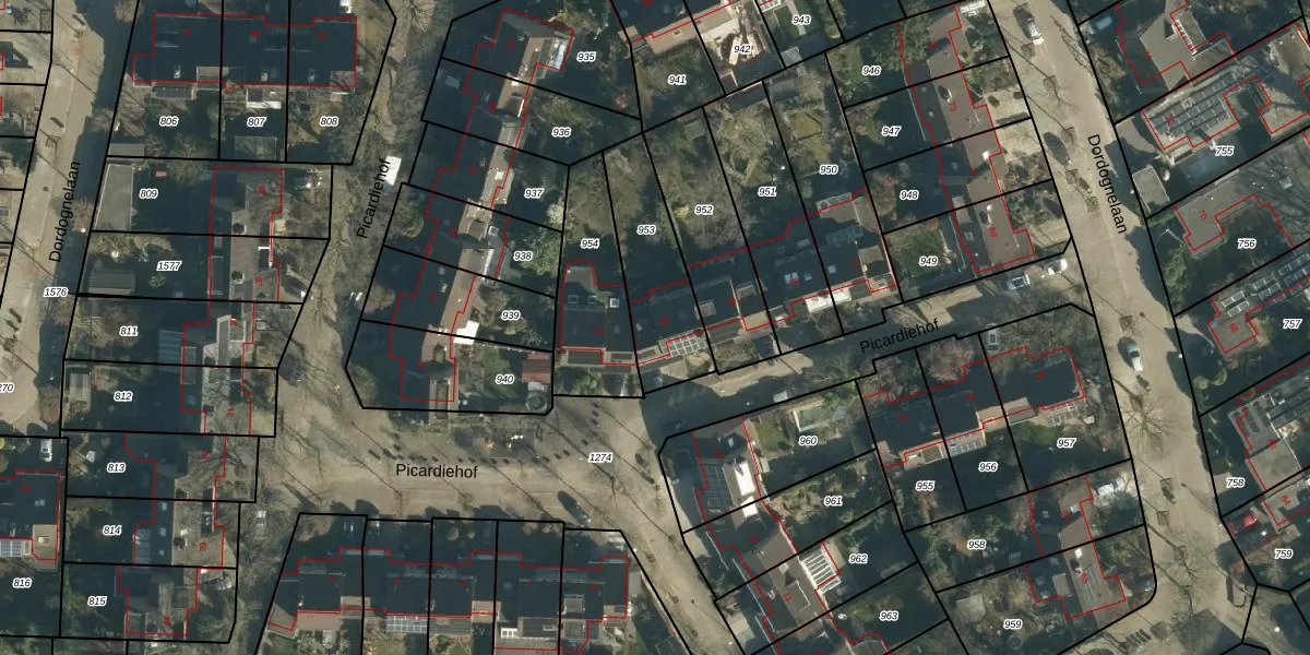 Het perceel waarop Picardiehof 20 staat heeft een oppervlakte van 352 m². Dit is een groot perceel. De perceeloppervlakte wordt geregistreerd door het Kadaster. Gedetailleerde informatie over de maten van dit perceel kunt u vinden in het rapport Kadastrale kaart met maatvoering van Picardiehof 20.