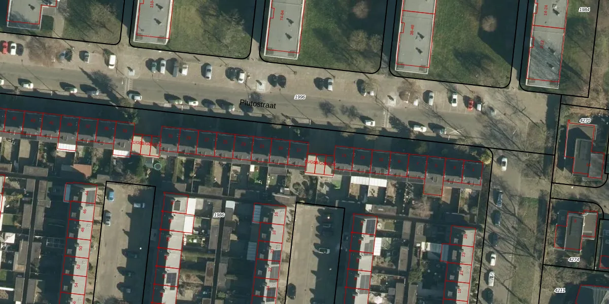 Het perceel waarop Plutostraat 17 staat heeft een oppervlakte van 1,1 ha. Dit is een zeer groot perceel. De perceeloppervlakte wordt geregistreerd door het Kadaster. Gedetailleerde informatie over de maten van dit perceel kunt u vinden in het rapport Kadastrale kaart met maatvoering van Plutostraat 17.