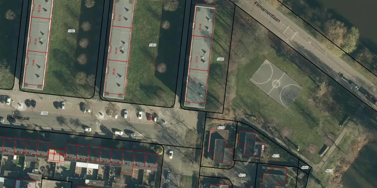 Het perceel waarop Plutostraat 2 staat heeft een oppervlakte van 1442 m². Dit is een zeer groot perceel. De perceeloppervlakte wordt geregistreerd door het Kadaster. Gedetailleerde informatie over de maten van dit perceel kunt u vinden in het rapport Kadastrale kaart met maatvoering van Plutostraat 2.