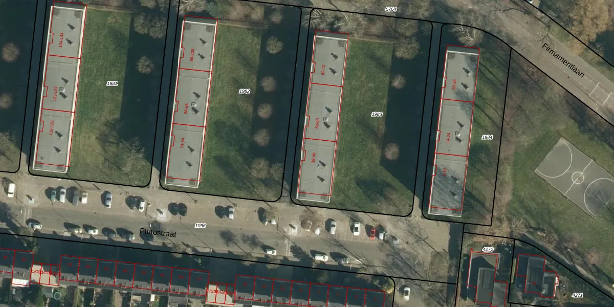 Het perceel waarop Plutostraat 40 staat heeft een oppervlakte van 2566 m². Dit is een zeer groot perceel. De perceeloppervlakte wordt geregistreerd door het Kadaster. Gedetailleerde informatie over de maten van dit perceel kunt u vinden in het rapport Kadastrale kaart met maatvoering van Plutostraat 40.
