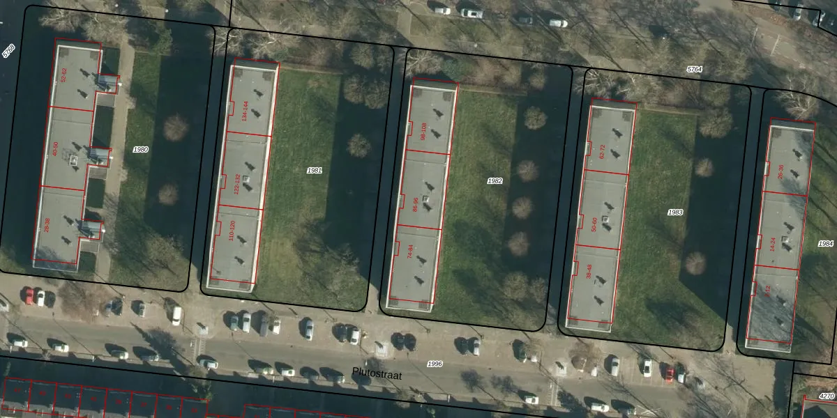 Het perceel waarop Plutostraat 90 staat heeft een oppervlakte van 2566 m². Dit is een zeer groot perceel. De perceeloppervlakte wordt geregistreerd door het Kadaster. Gedetailleerde informatie over de maten van dit perceel kunt u vinden in het rapport Kadastrale kaart met maatvoering van Plutostraat 90.