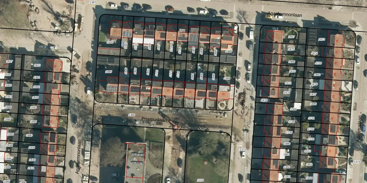 Het perceel waarop Priamuslaan 13 staat heeft een oppervlakte van 155 m². Dit is een middelgroot perceel. De perceeloppervlakte wordt geregistreerd door het Kadaster. Gedetailleerde informatie over de maten van dit perceel kunt u vinden in het rapport Kadastrale kaart met maatvoering van Priamuslaan 13.
