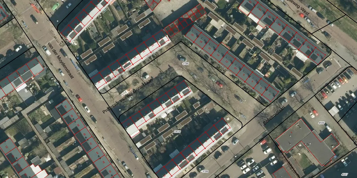 Professor van der Grintenlaan 1 is gelegen op kadastraal perceel STR03C2818. Deze kadastrale aanduiding is uniek en wordt gebruikt door het Kadaster om eigendomsrechten en andere zakelijke rechten vast te leggen. Het perceel maakt onderdeel uit van de kadastrale gemeente Strijp.