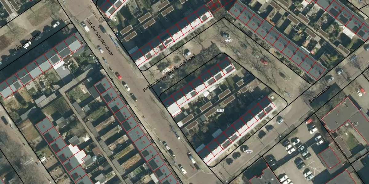 Professor van der Grintenlaan 9 is gelegen op kadastraal perceel STR03C2818. Deze kadastrale aanduiding is uniek en wordt gebruikt door het Kadaster om eigendomsrechten en andere zakelijke rechten vast te leggen. Het perceel maakt onderdeel uit van de kadastrale gemeente Strijp.