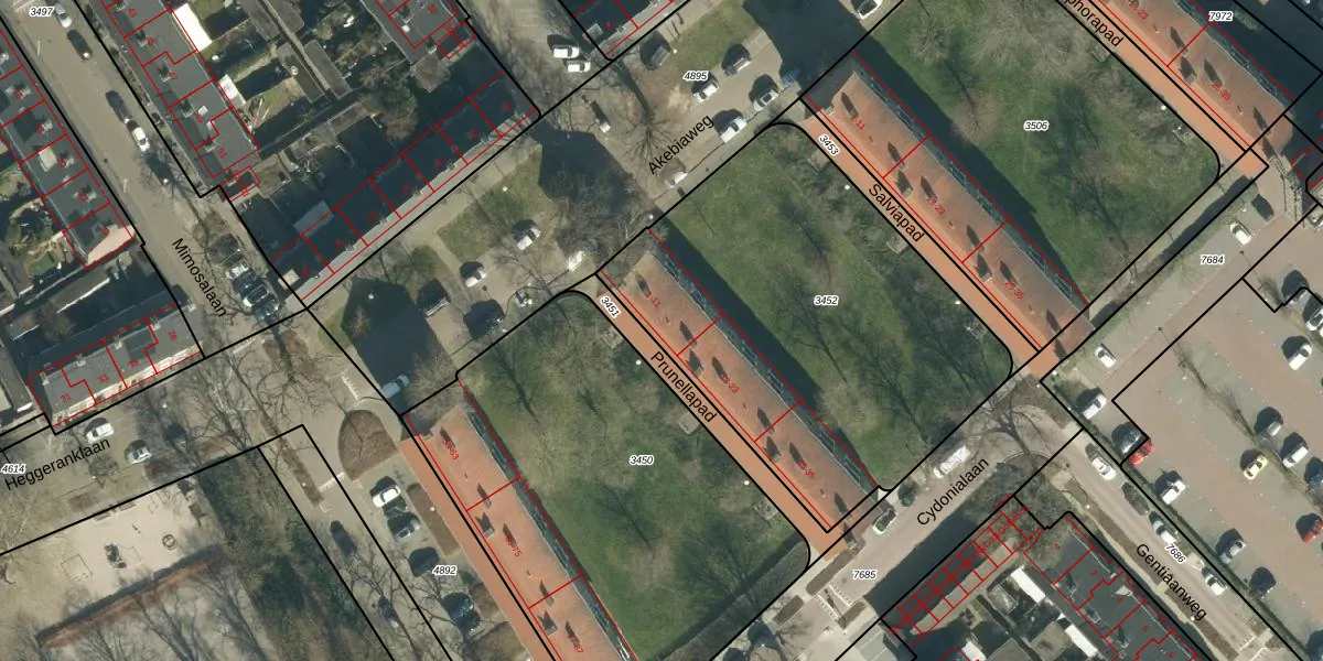 Het perceel waarop Prunellapad 3 staat heeft een oppervlakte van 2043 m². Dit is een zeer groot perceel. De perceeloppervlakte wordt geregistreerd door het Kadaster. Gedetailleerde informatie over de maten van dit perceel kunt u vinden in het rapport Kadastrale kaart met maatvoering van Prunellapad 3.