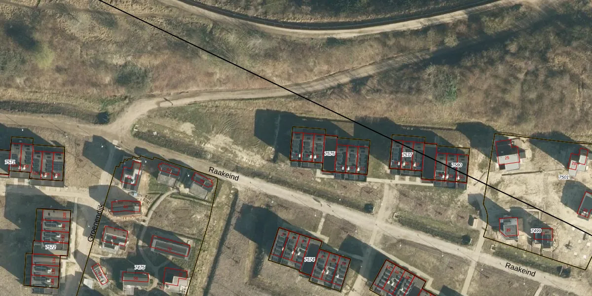 Raakeind 1 is gelegen op kadastraal perceel WSL01W7575. Deze kadastrale aanduiding is uniek en wordt gebruikt door het Kadaster om eigendomsrechten en andere zakelijke rechten vast te leggen. Het perceel maakt onderdeel uit van de kadastrale gemeente Woensel.