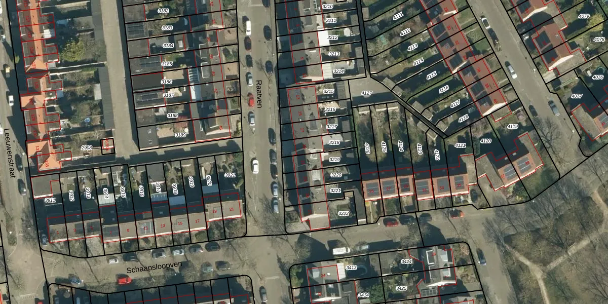 Het perceel waarop Raatven 19 staat heeft een oppervlakte van 135 m². Dit is een middelgroot perceel. De perceeloppervlakte wordt geregistreerd door het Kadaster. Gedetailleerde informatie over de maten van dit perceel kunt u vinden in het rapport Kadastrale kaart met maatvoering van Raatven 19.