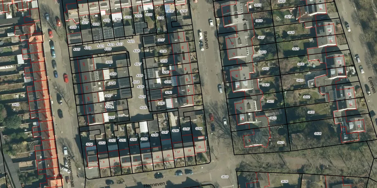 Het perceel waarop Raatven 58 staat heeft een oppervlakte van 156 m². Dit is een middelgroot perceel. De perceeloppervlakte wordt geregistreerd door het Kadaster. Gedetailleerde informatie over de maten van dit perceel kunt u vinden in het rapport Kadastrale kaart met maatvoering van Raatven 58.