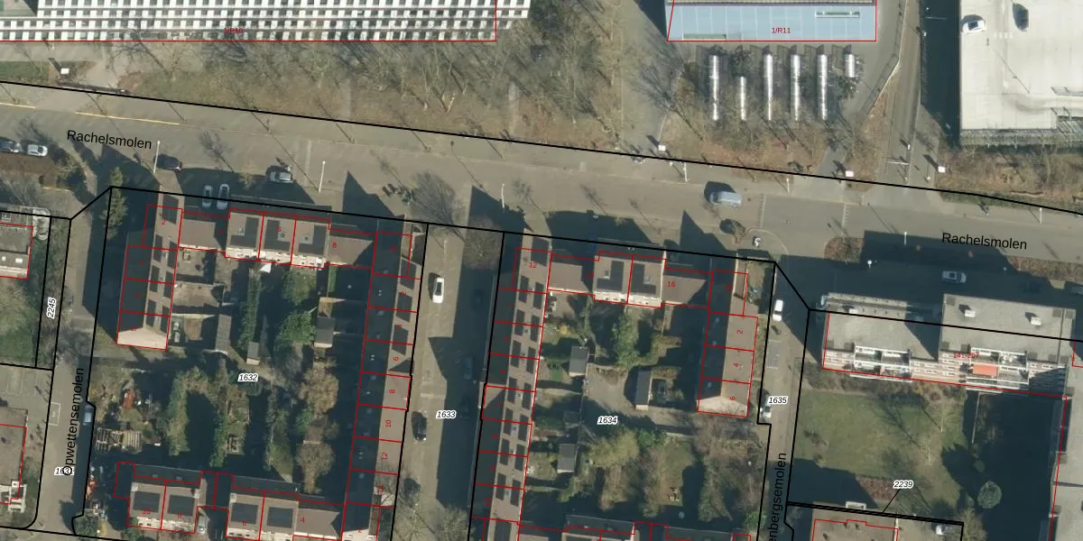 Het perceel waarop Rachelsmolen 12 staat heeft een oppervlakte van 3376 m². Dit is een zeer groot perceel. De perceeloppervlakte wordt geregistreerd door het Kadaster. Gedetailleerde informatie over de maten van dit perceel kunt u vinden in het rapport Kadastrale kaart met maatvoering van Rachelsmolen 12.