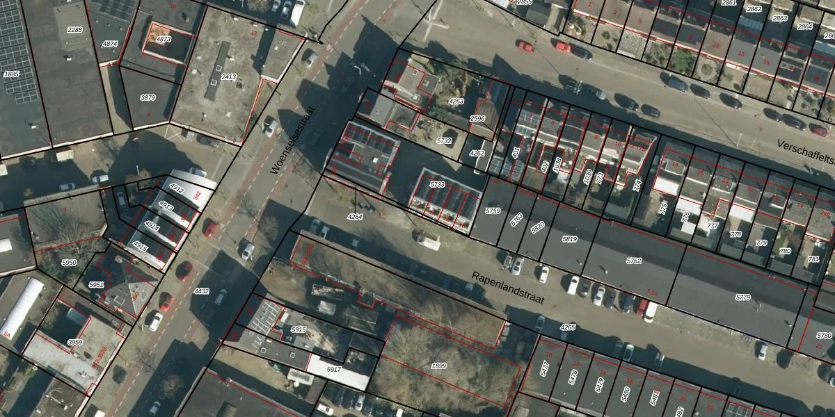 Rapenlandstraat 1 is gelegen op kadastraal perceel WSL01L5733. Deze kadastrale aanduiding is uniek en wordt gebruikt door het Kadaster om eigendomsrechten en andere zakelijke rechten vast te leggen. Het perceel maakt onderdeel uit van de kadastrale gemeente Woensel.