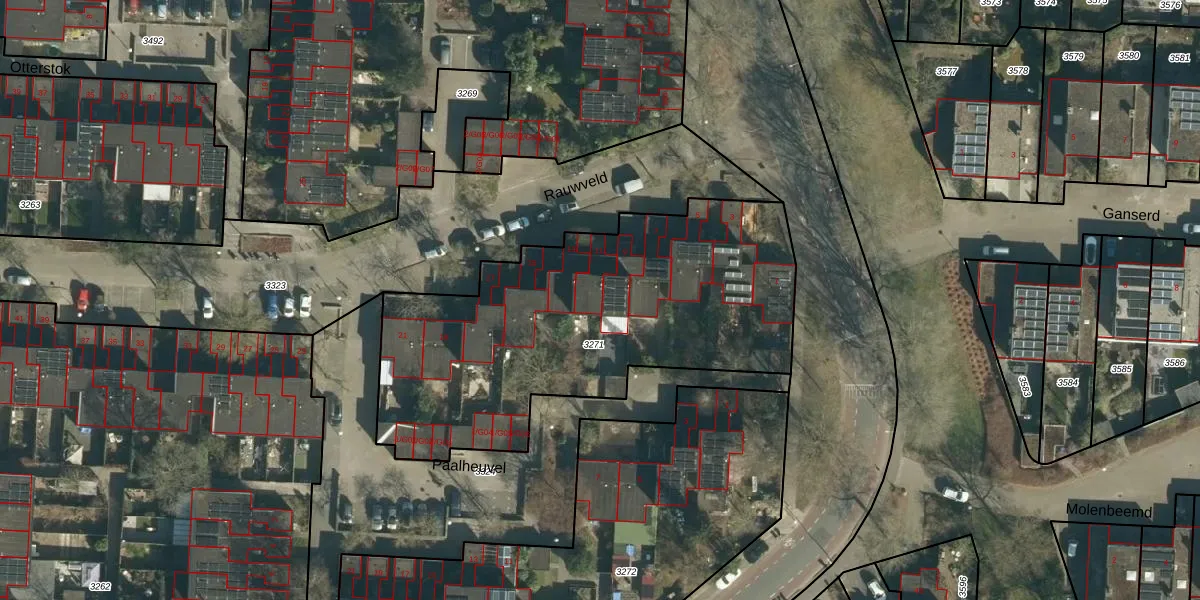 Het perceel waarop Rauwveld 11 staat heeft een oppervlakte van 1875 m². Dit is een zeer groot perceel. De perceeloppervlakte wordt geregistreerd door het Kadaster. Gedetailleerde informatie over de maten van dit perceel kunt u vinden in het rapport Kadastrale kaart met maatvoering van Rauwveld 11.