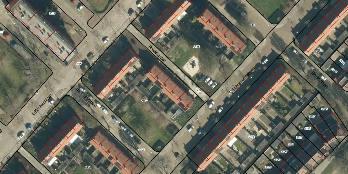 Het perceel waarop Ravelstraat 5 staat heeft een oppervlakte van 2474 m². Dit is een zeer groot perceel. De perceeloppervlakte wordt geregistreerd door het Kadaster. Gedetailleerde informatie over de maten van dit perceel kunt u vinden in het rapport Kadastrale kaart met maatvoering van Ravelstraat 5.