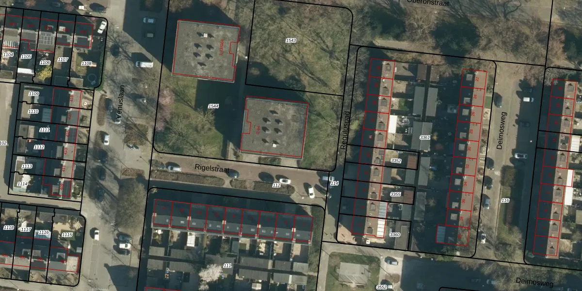 Het perceel waarop Rigelstraat 24 staat heeft een oppervlakte van 2562 m². Dit is een zeer groot perceel. De perceeloppervlakte wordt geregistreerd door het Kadaster. Gedetailleerde informatie over de maten van dit perceel kunt u vinden in het rapport Kadastrale kaart met maatvoering van Rigelstraat 24.