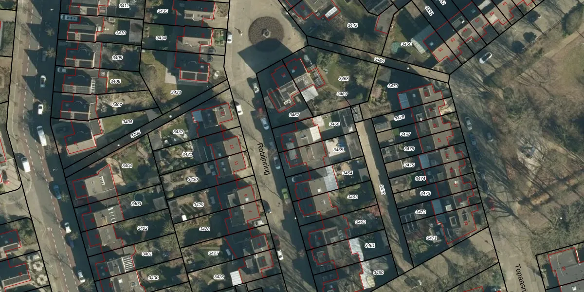 Het perceel waarop Robijnring 14 staat heeft een oppervlakte van 242 m². Dit is een middelgroot perceel. De perceeloppervlakte wordt geregistreerd door het Kadaster. Gedetailleerde informatie over de maten van dit perceel kunt u vinden in het rapport Kadastrale kaart met maatvoering van Robijnring 14.