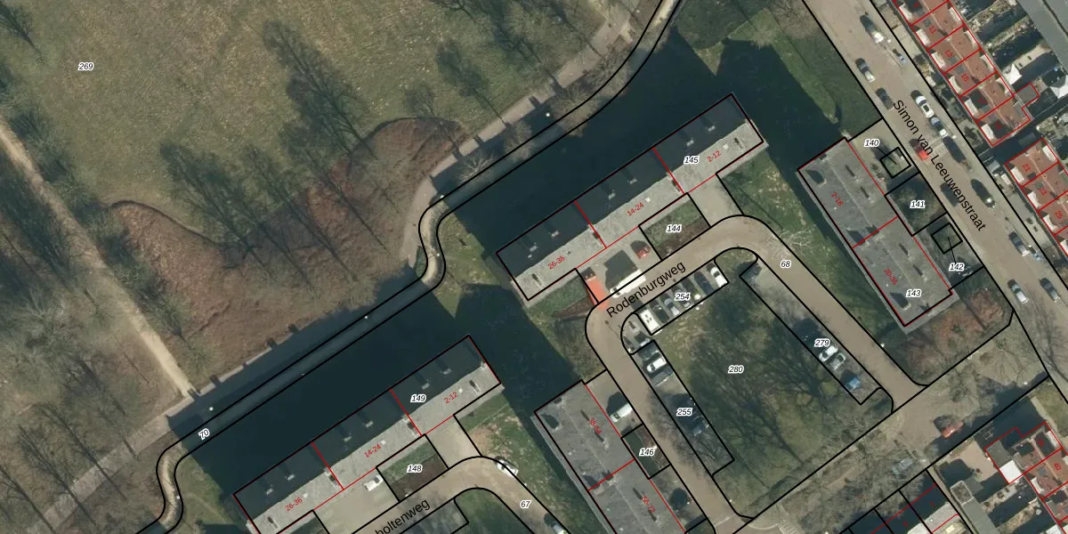 Rodenburgweg 32 is gelegen op kadastraal perceel STR03E145. Deze kadastrale aanduiding is uniek en wordt gebruikt door het Kadaster om eigendomsrechten en andere zakelijke rechten vast te leggen. Het perceel maakt onderdeel uit van de kadastrale gemeente Strijp.