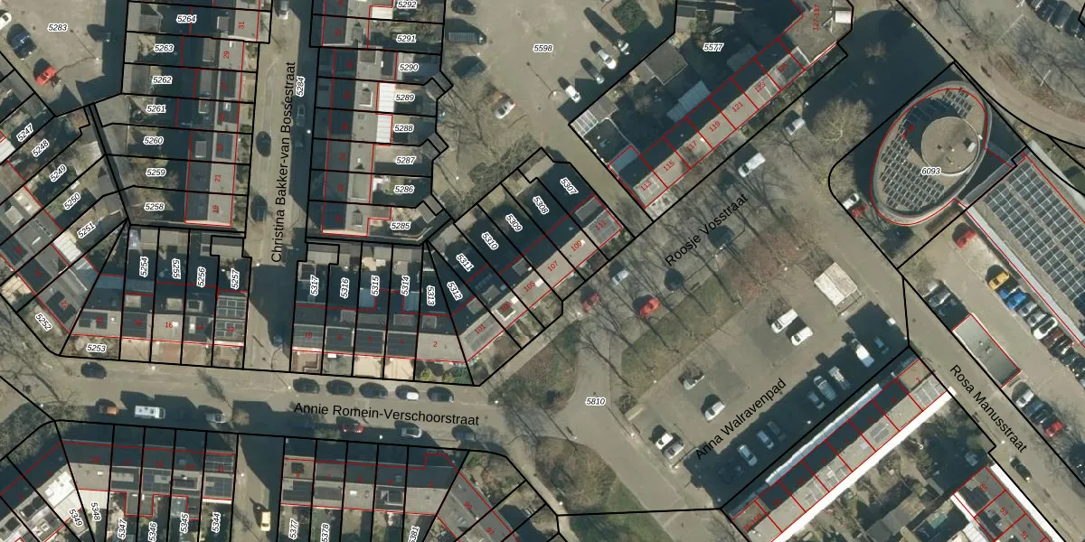 Roosje Vosstraat 107 is gelegen op kadastraal perceel WSL01G5309. Deze kadastrale aanduiding is uniek en wordt gebruikt door het Kadaster om eigendomsrechten en andere zakelijke rechten vast te leggen. Het perceel maakt onderdeel uit van de kadastrale gemeente Woensel.