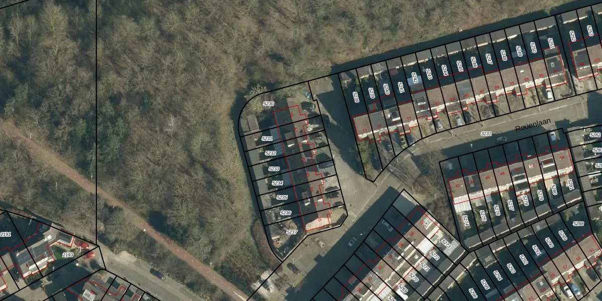 Rouenlaan 65 is gelegen op kadastraal perceel WSL01W5232. Deze kadastrale aanduiding is uniek en wordt gebruikt door het Kadaster om eigendomsrechten en andere zakelijke rechten vast te leggen. Het perceel maakt onderdeel uit van de kadastrale gemeente Woensel.