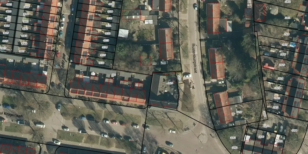 Het perceel waarop Rustenburgstraat 60 staat heeft een oppervlakte van 412 m². Dit is een groot perceel. De perceeloppervlakte wordt geregistreerd door het Kadaster. Gedetailleerde informatie over de maten van dit perceel kunt u vinden in het rapport Kadastrale kaart met maatvoering van Rustenburgstraat 60.
