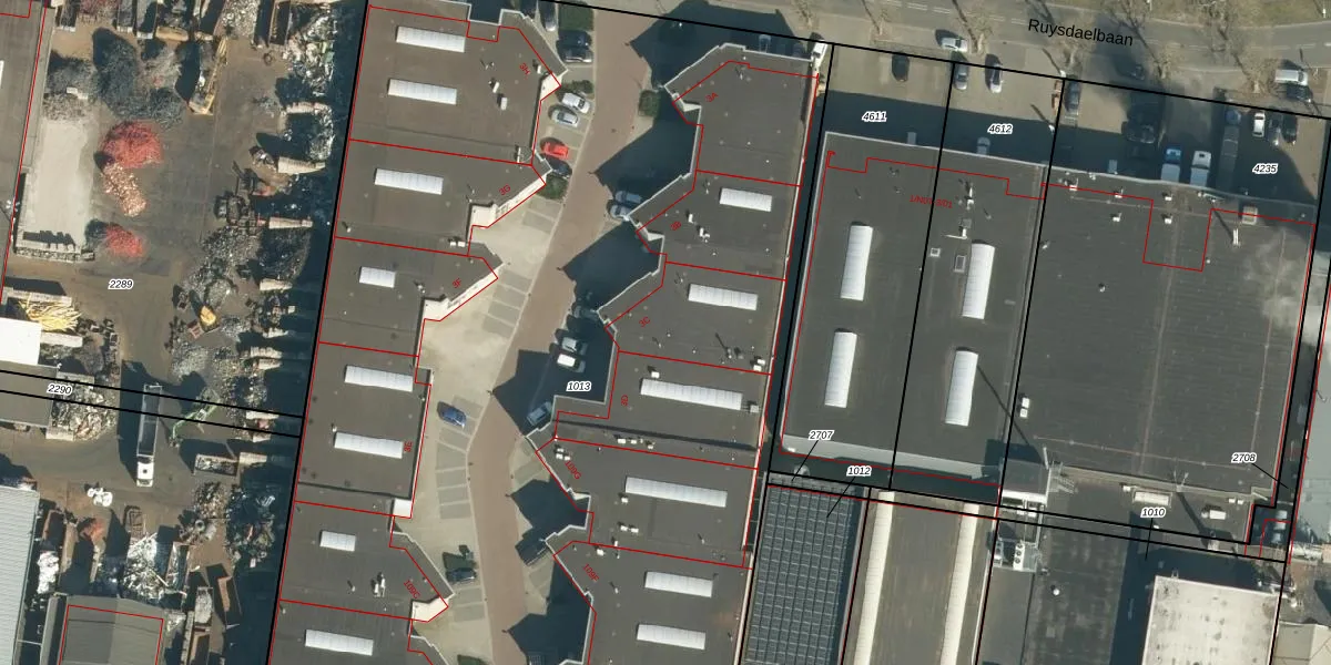 Het perceel waarop Ruysdaelbaan 3-C staat heeft een oppervlakte van 9445 m². Dit is een zeer groot perceel. De perceeloppervlakte wordt geregistreerd door het Kadaster. Gedetailleerde informatie over de maten van dit perceel kunt u vinden in het rapport Kadastrale kaart met maatvoering van Ruysdaelbaan 3-C.