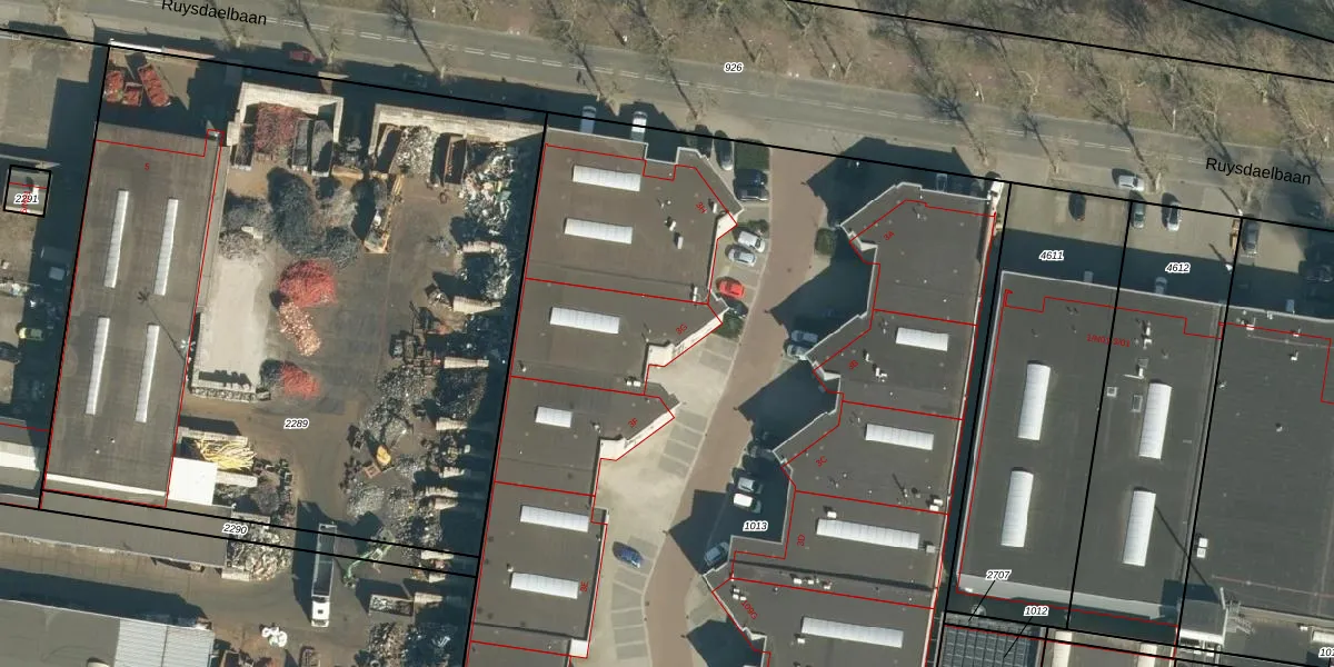 Het perceel waarop Ruysdaelbaan 3-G staat heeft een oppervlakte van 9445 m². Dit is een zeer groot perceel. De perceeloppervlakte wordt geregistreerd door het Kadaster. Gedetailleerde informatie over de maten van dit perceel kunt u vinden in het rapport Kadastrale kaart met maatvoering van Ruysdaelbaan 3-G.