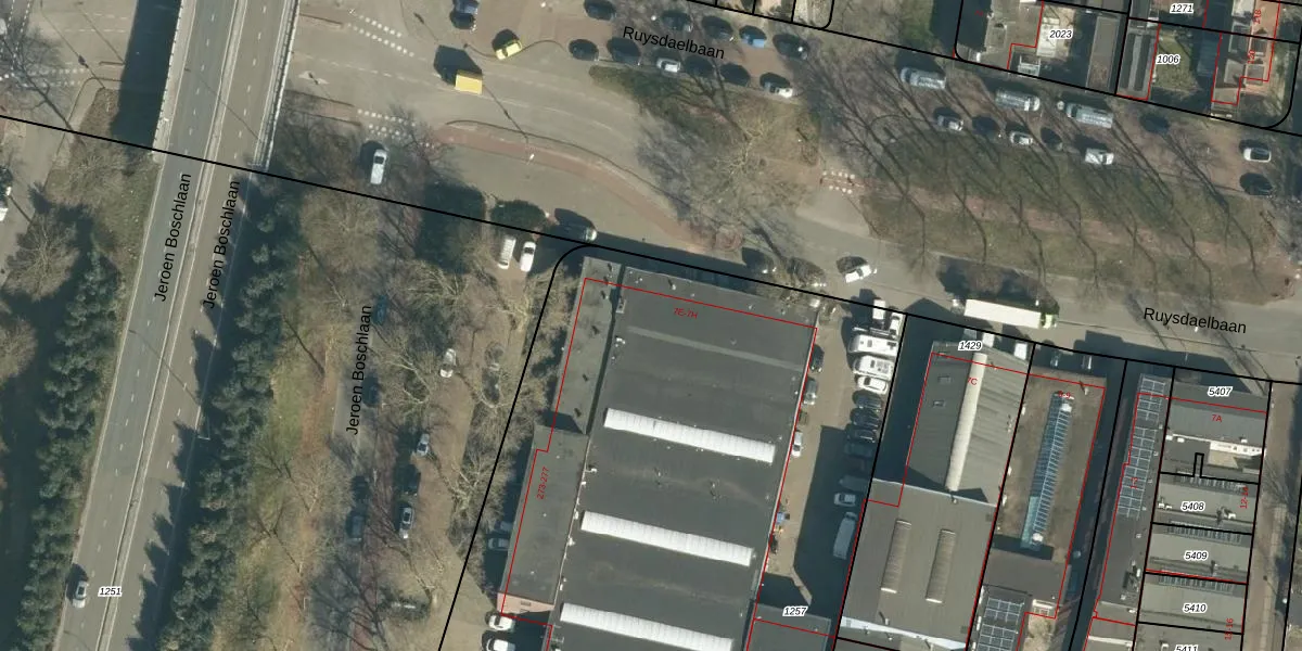 Het perceel waarop Ruysdaelbaan 7-H staat heeft een oppervlakte van 4465 m². Dit is een zeer groot perceel. De perceeloppervlakte wordt geregistreerd door het Kadaster. Gedetailleerde informatie over de maten van dit perceel kunt u vinden in het rapport Kadastrale kaart met maatvoering van Ruysdaelbaan 7-H.