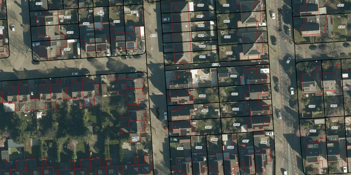 Het perceel waarop Saffier 8 staat heeft een oppervlakte van 330 m². Dit is een groot perceel. De perceeloppervlakte wordt geregistreerd door het Kadaster. Gedetailleerde informatie over de maten van dit perceel kunt u vinden in het rapport Kadastrale kaart met maatvoering van Saffier 8.