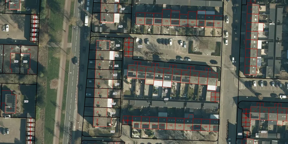 Samarialaan 165 is gelegen op kadastraal perceel WSL01M955. Deze kadastrale aanduiding is uniek en wordt gebruikt door het Kadaster om eigendomsrechten en andere zakelijke rechten vast te leggen. Het perceel maakt onderdeel uit van de kadastrale gemeente Woensel.