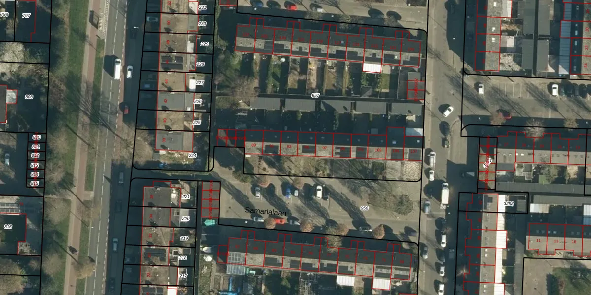 Samarialaan 93 is gelegen op kadastraal perceel WSL01M957. Deze kadastrale aanduiding is uniek en wordt gebruikt door het Kadaster om eigendomsrechten en andere zakelijke rechten vast te leggen. Het perceel maakt onderdeel uit van de kadastrale gemeente Woensel.