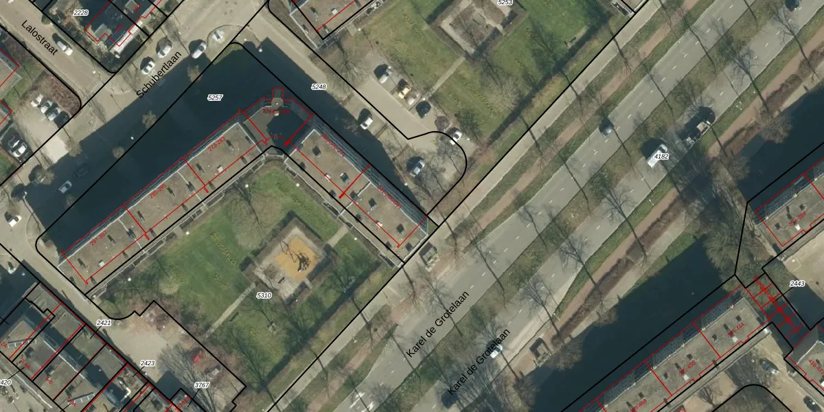 Het perceel waarop Schubertlaan 241 staat heeft een oppervlakte van 2035 m². Dit is een zeer groot perceel. De perceeloppervlakte wordt geregistreerd door het Kadaster. Gedetailleerde informatie over de maten van dit perceel kunt u vinden in het rapport Kadastrale kaart met maatvoering van Schubertlaan 241.