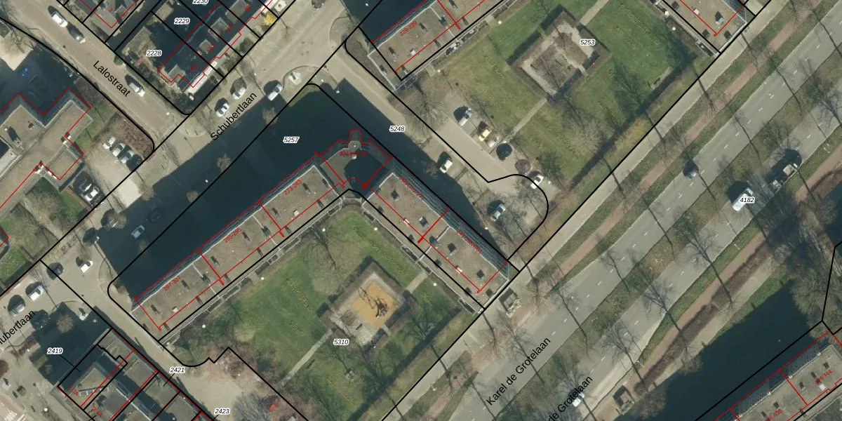 Het perceel waarop Schubertlaan 265 staat heeft een oppervlakte van 2035 m². Dit is een zeer groot perceel. De perceeloppervlakte wordt geregistreerd door het Kadaster. Gedetailleerde informatie over de maten van dit perceel kunt u vinden in het rapport Kadastrale kaart met maatvoering van Schubertlaan 265.