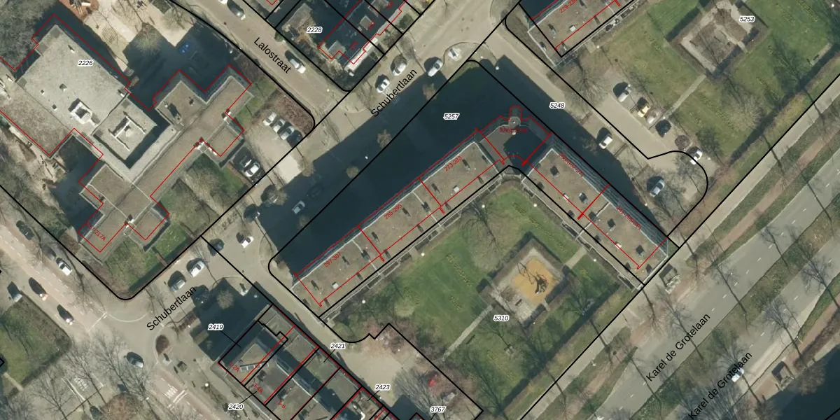 Het perceel waarop Schubertlaan 293 staat heeft een oppervlakte van 2035 m². Dit is een zeer groot perceel. De perceeloppervlakte wordt geregistreerd door het Kadaster. Gedetailleerde informatie over de maten van dit perceel kunt u vinden in het rapport Kadastrale kaart met maatvoering van Schubertlaan 293.