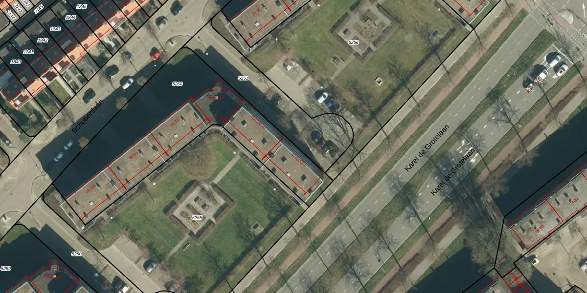 Het perceel waarop Schubertlaan 39 staat heeft een oppervlakte van 2080 m². Dit is een zeer groot perceel. De perceeloppervlakte wordt geregistreerd door het Kadaster. Gedetailleerde informatie over de maten van dit perceel kunt u vinden in het rapport Kadastrale kaart met maatvoering van Schubertlaan 39.